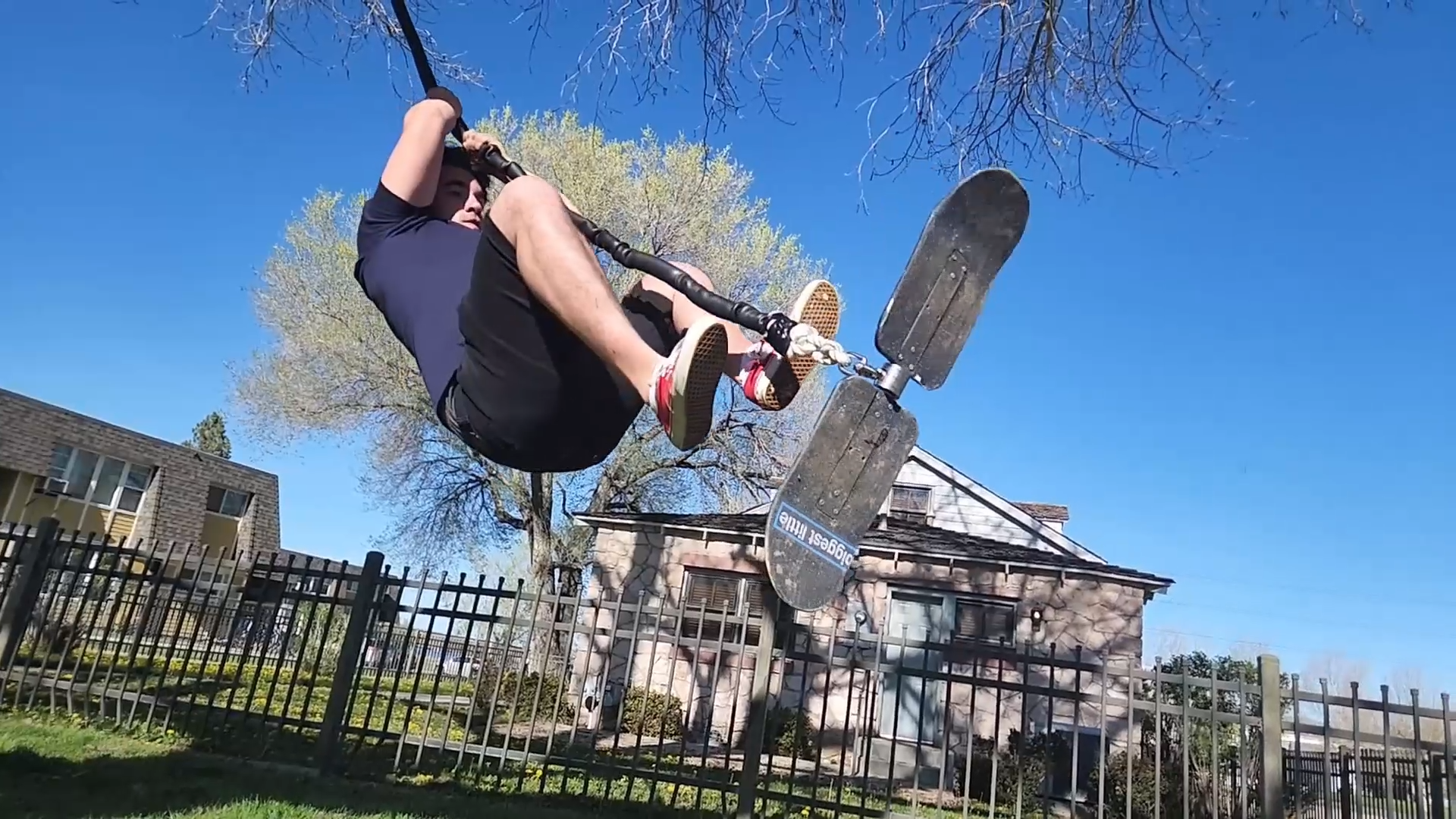 A split skateboard-style deck connects to a central swivel and rope, allowing riders to spin freely while using the momentum of the swing to perform tricks.